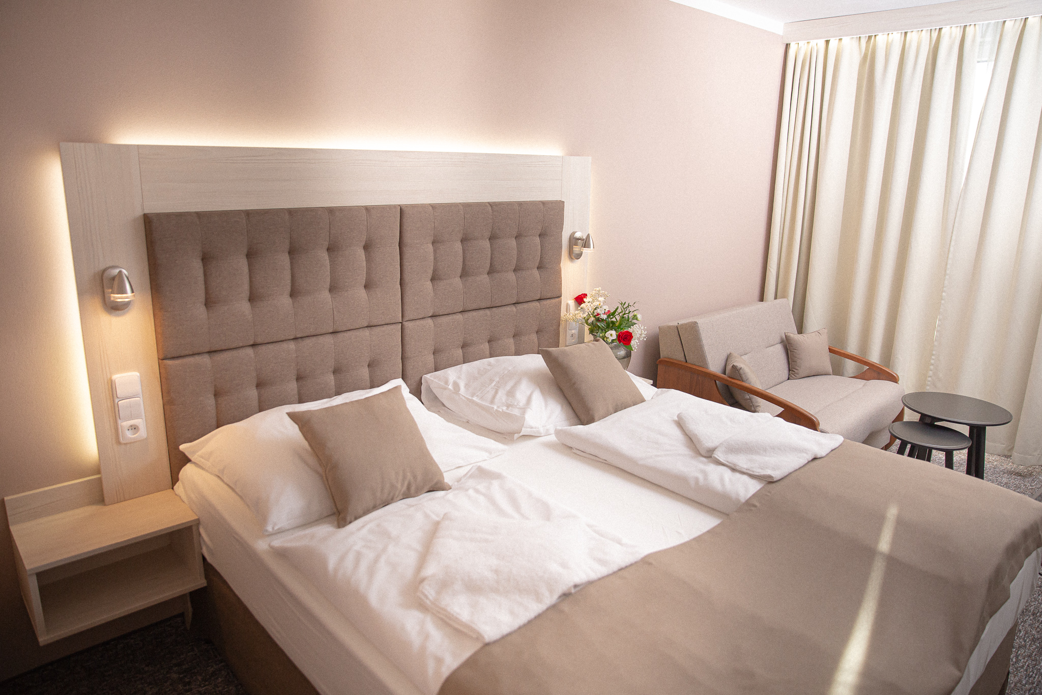 V hotelu jsou příjemně vybavené dvoulůžkové, třílůžkové a čtyřlůžkové pokoje. Pro rodiny s dětmi jsou k dispozici pětilůžkové apartmány. Celková ubytovací kapacita je 55 pokojů, které v roce 2016 prošly rekonstrukcí. Všechny pokoje mají sprchu, WC, TV a WI-FI.