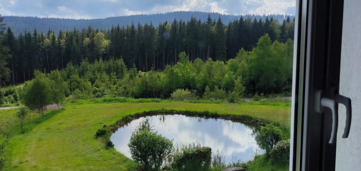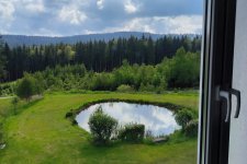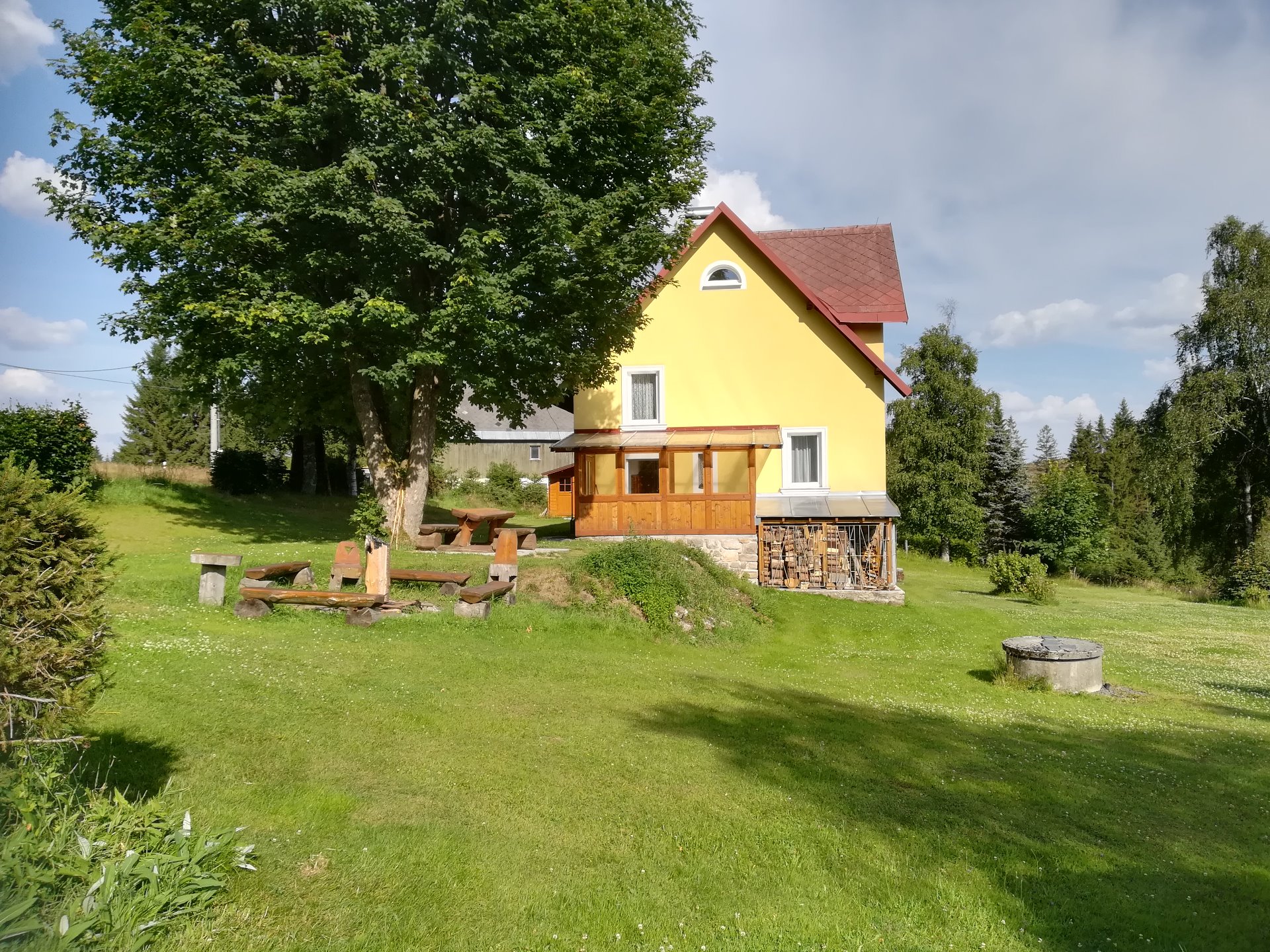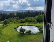 - Součástí chaty je i veliká zahrada s jezírkem a s ohništěm s posezením