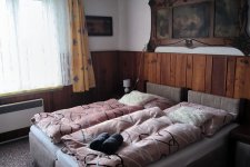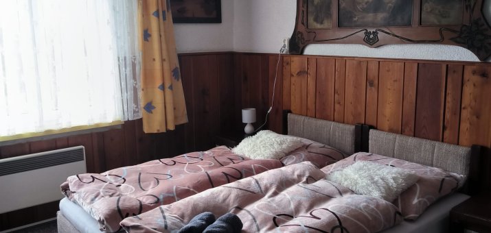 - Přízemí: sociální zařízení, kuchyň a společenská místnost a dvoulůžkový pokoj č. 1