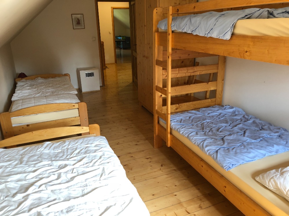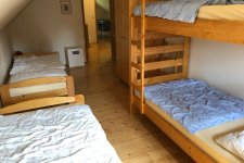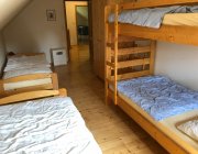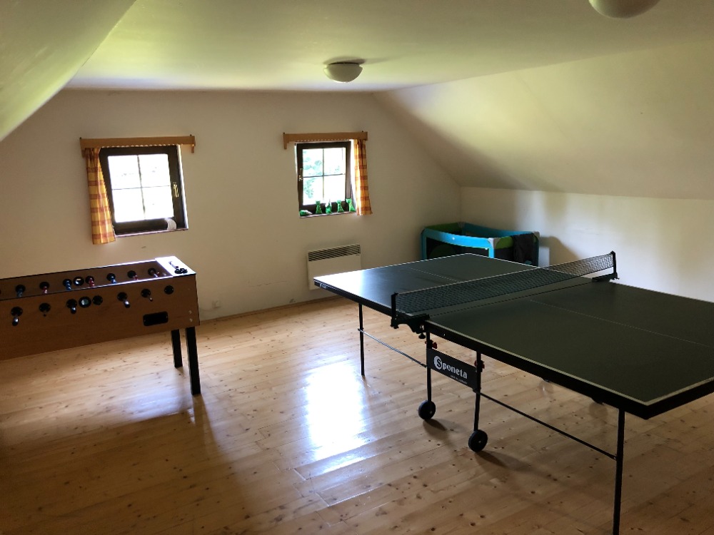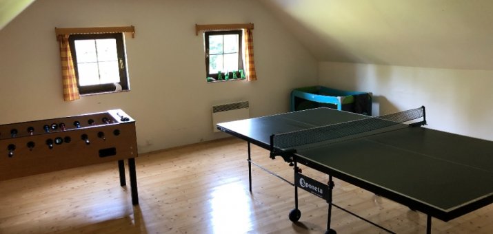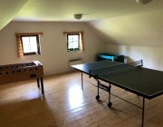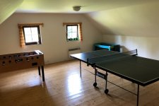 Podkroví: ložnice 15 m2 2x samostatné lůžko 1x patrové lůžko, ložnice 15 m2,2x samostatné lůžko 1x patrové lůžko, 1x koupelna(vana),samostatné WC ,místnost s ping-pongovým stolem