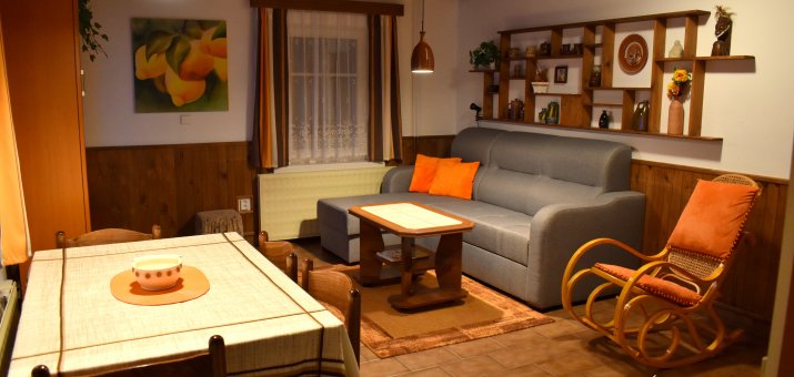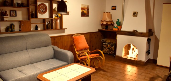 Objekt 1: Jedná se o apartmán, samostatný domeček pro 2 až 4 osoby. Hostům je k dispozici ložnice, obývací pokoj s krbem a TV, kuchyňka a sociální zařízení.